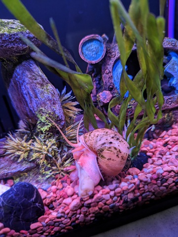 Sherlock was given to me a few weeks ago in a small plastic food container. I knew nothing about mystery snails, much less of proper living arrangements for them, so I asked Google, who told me in no uncertain terms that one mystery snail needs a five-gallon tank, minimum… but I ended up getting him a 3.7-gallon tank. I regret that decision now, of course. One mystery snail needs a minimum of five gallons of water! How difficult would it be to, I don’t know, set up Sherlock’s habitat in accordance with the experts’ wisdom? So now Sherlock is in a tank that’s too small for the maintenance of his optimal health, and I’m not sure what to do about it. (Is it too late to make an exchange? I’m pretty sure that the store won’t accept a return of a used tank, but I can ask. I’m not sure what I was thinking when I got this tank.) Maybe I’ll get a five-gallon tank for Sherlock at some point and just grow plants in the 3.7 gallon-tank.