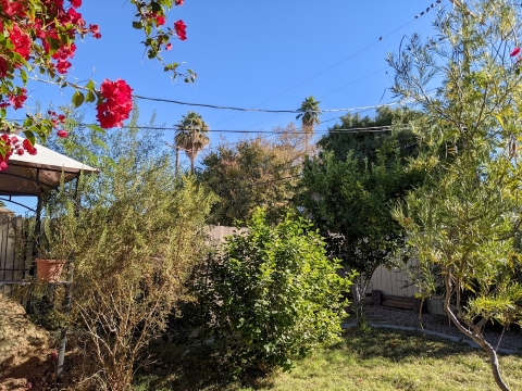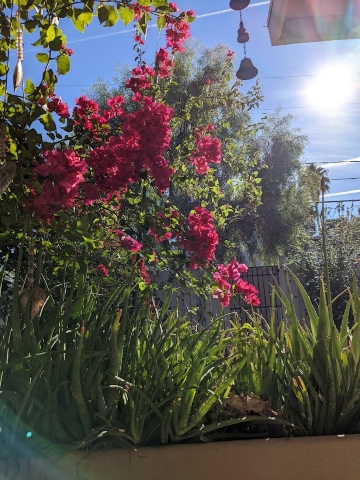 But I felt awake and refreshed this time, happy to get up into the room now bright with morning sun. From the quiet kitchen window I watched four species of birds hopping lightly through the branches of bougainvillea thickly shrouding my patio in a tangle of vines, green leaves and clusters of bright fuchsia, flitting occasionally to the nearby watering hole and back again. More birds came to the watering hole from other directions. Watching the birds in the bougainvillea around the patio, the birds in the watering hole, the small desert cottontail rabbit – a permanent resident who ought to be named at this point – also at the edge of the patio, up on his hindlegs reaching for bougainvillea branches, I felt immensely grateful to live in this tranquil downtown neighborhood.