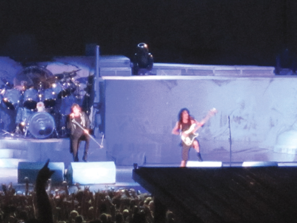 Iron Maiden gave us a show that was 110% heart and what had to be every ounce of their physical endurance. Throughout the hour and forty-five minute performance, they sprinted around and took flying leaps across the stage, constantly rearranging themselves from one end to the other. Bruce Dickinson appeared everywhere with swift agility, singing from both levels of the set and frequently wielding his mic like a harpoon. No way would I ever have guessed that these guys are in their mid-to-upper 50’s! Dickinson’s voice was spot-on impeccable, strong and clear, and his singing was as close to perfect as it gets. He might be aging, but his voice and lungs are clearly not.