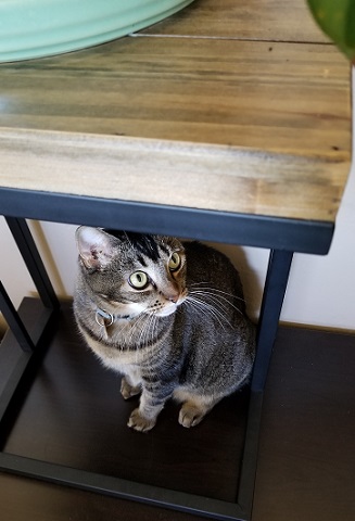 Honestly, though, I enjoyed the chance to get more exercise into my day. Because our queen-size bed is a sleigh bed, it’s heavy and ungainly, and I had to get all the other furniture out of the way before I could re-position it. I moved out the chest of drawers, the two night-tables, the long under-the-window table (aka the kitty window seat), my desk and chair, the corner shelving thing (no idea what it’s called), the vanity-less vanity stool (the vanity itself is outside on the balcony, having been re-purposed as a table for plants) and the clothes hamper. I shoved it all into the hallway, the bathroom, Callaghan’s studio and the main room, along with the objects that had been on the floor and on the furniture surfaces. Then I worked on moving the bed, which had to be turned around 180 degrees. I did some dragging and pulling, but I mostly sat on the floor, planted my feet on the bed and used it as a leg press. Great work-out! Once the bed was situated in its new spot, I could move all the furniture and stuff back in.