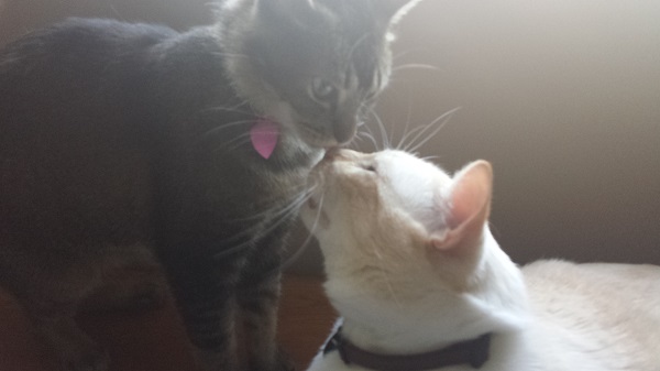 I try to help. I’ll sometimes intercept Nounours in the middle of the night if I’m semi-awake and he walks behind my head to get to Callaghan. I’ll grab him and hug him to my chest, and he’ll lay there purring for a while. I fall back asleep, though, and then Nounours continues on his way. Destination: Daddy.