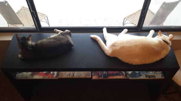 Callaghan’s been embroiled in an ongoing struggle with Nounours ever since we brought the big guy home with Ronnie James to our Little House in the Rhône-Alpes in October 2012. It’s that ancient grievance of many a cat-parent: Kitty insists that you wake up when he wants you up, not when you wish to wake up. Sometimes, he wants you up long before you want to get up.