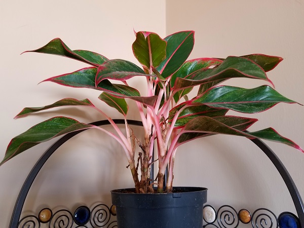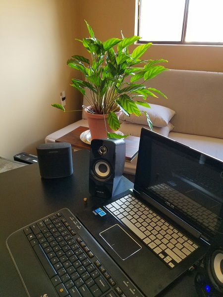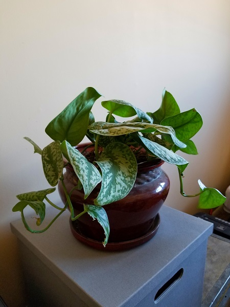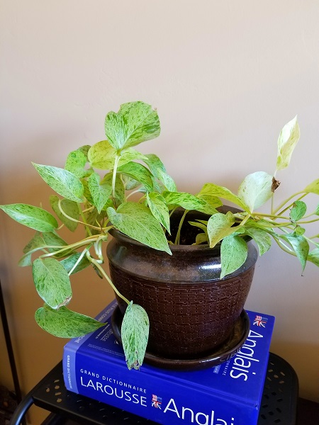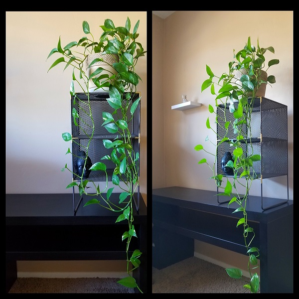 Finally, Barclay, my first, sits further out in front of my desk and to the right, same place he’s been… I did have to purchase this stand for him, though, as he needed a greater height. His tendrils had grown to where they were coiling on the floor. I found this cheap little metal stand at Ross.