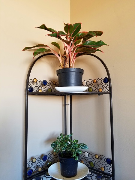 Angel sits beneath, on the second shelf. I picked him up from the florist’s section at Fry’s. He’s also doing well, though he’s quite fragile. He’s an aluminum plant.