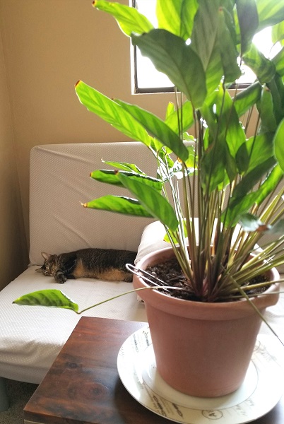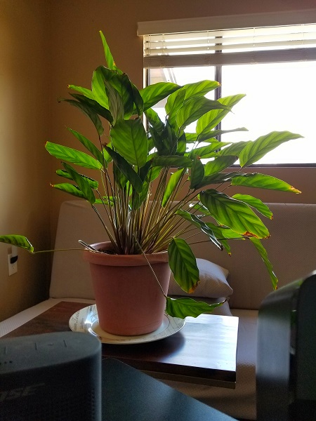 Just in front of my desk and to the left: Robbie. We migrated him to my office from the living room. Within 24 hours of moving him in here, he spread out, opened up, and turned a lighter, brighter shade of green. Plants love the strong daylight in this room! There’s no direct sunlight in here, so all of these guys are low-light/indirect sunlight plants.