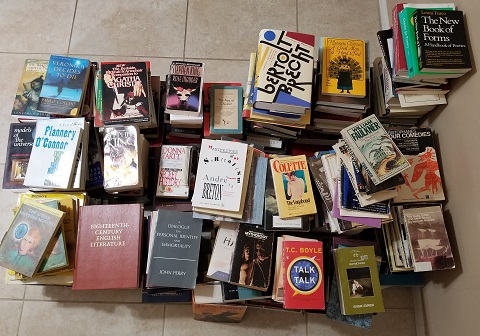 I’ve carried books around with me all of my life. Over the years, I’ve sold, traded, donated and given away hundreds of books. I’ve lost some; I’ve “lent” some. But somehow, I still always move with at least ten good-size boxes of books.  My current collection includes some that I’d left in France (a pile of Shakespeare and some Russian lit, some of them duplicates, mysteriously enough) in my attempt to bring down the weight of our overseas shipping, and I have a small stack set aside for a garage sale we’re planning in the upcoming weeks. Still, I’m now confronted by piles like this: